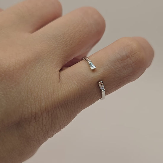 This simple open band features two striking baguettes at either end, making it the perfect piece for layering with your favorite solitaires or wearing solo for an edgy, rebellious vibe. Its sleek design effortlessly enhances any collection, offering versatility and bold style in one elegant piece.