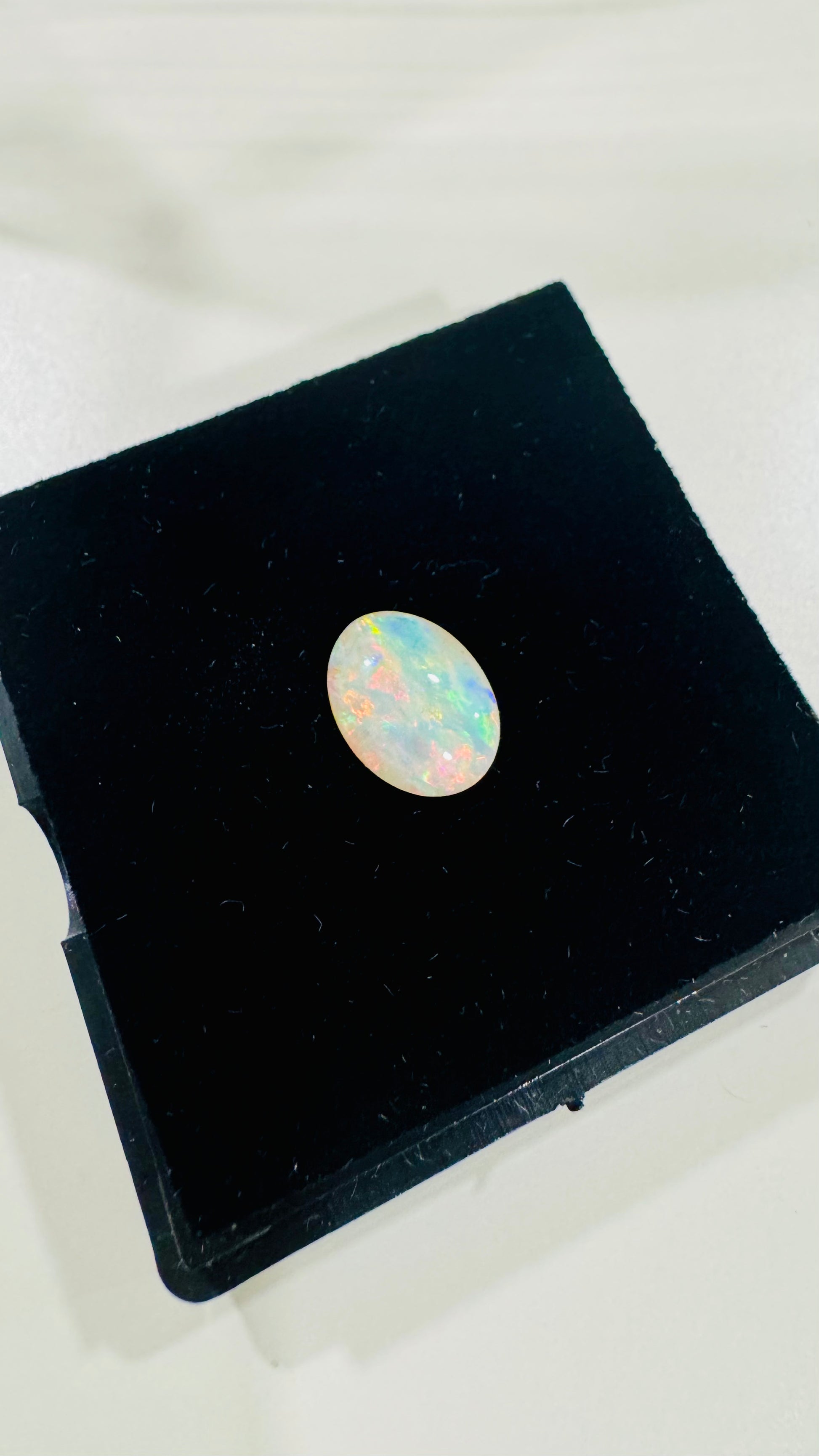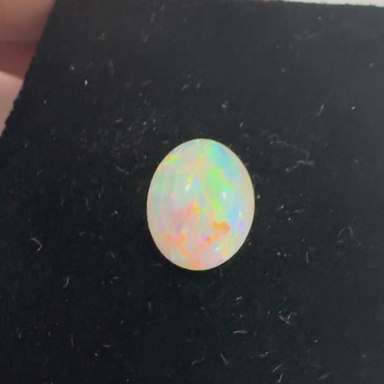A luminous natural oval opal weighing 2.51 carats, featuring a soft milky body with vivid flashes of blue, green, yellow, and fiery pastel tones. The play-of-color shifts beautifully with movement and light, giving this stone a living, almost ethereal presence.