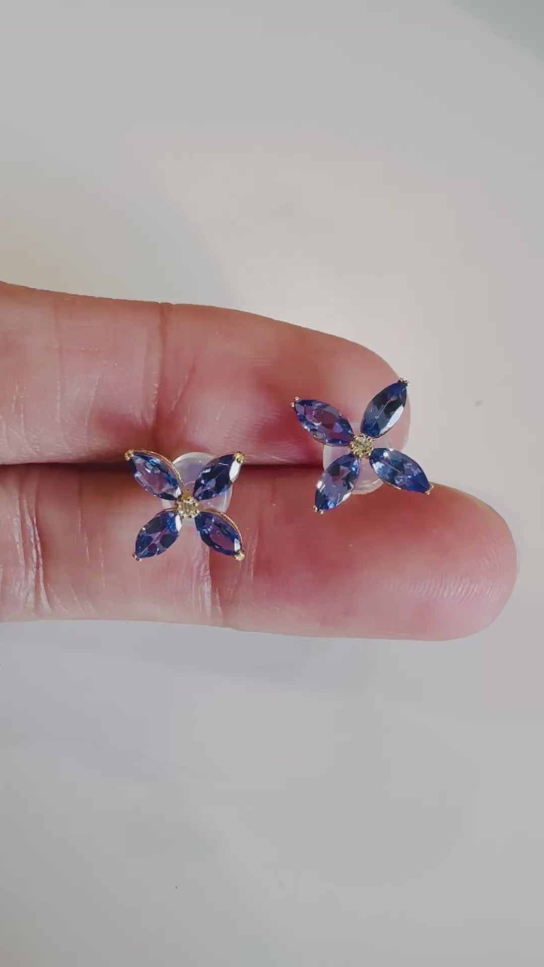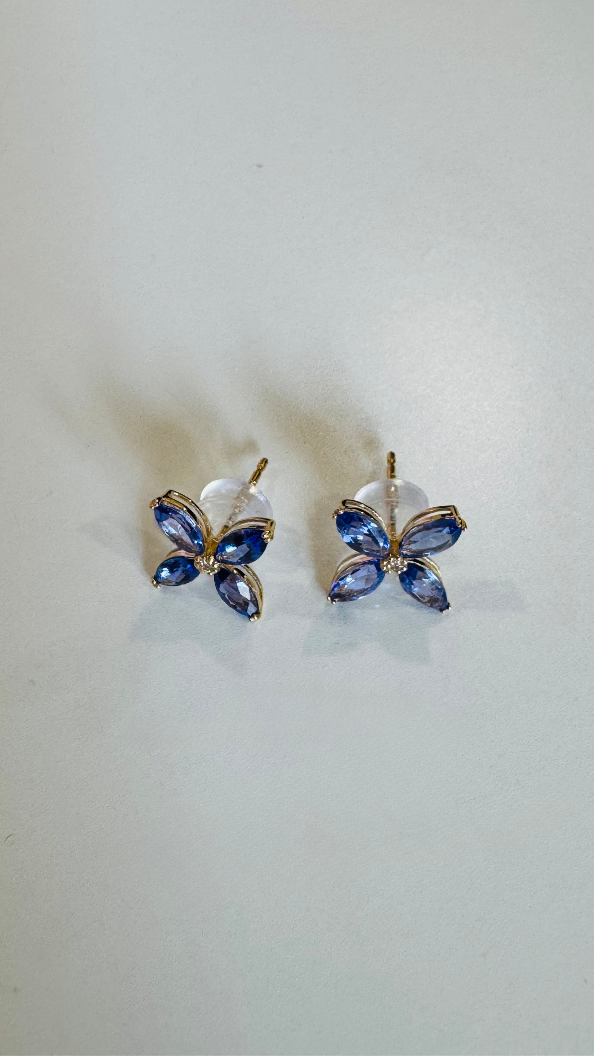 These refined tanzanite stud earrings feature a graceful floral-inspired design, composed of marquise-cut natural tanzanite stones arranged to create soft movement and dimension. With a total tanzanite weight of 1.30 carats, the stones display a rich blue-violet hue with natural depth and sparkle.